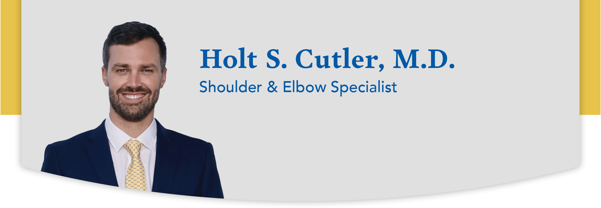 Dr. Holt Cutler is a fellowship-trained orthopaedic surgeon who specializes in shoulder and elbow disorders and injuries at Carrell Clinic. A Dallas native, Dr. Cutler takes pride in providing the most advanced techniques for shoulder arthroscopy, shoulder replacement surgery, labral repair, shoulder separation, rotator cuff disorders, shoulder instability, tendon injuries, elbow injuries, sports-related injuries, and upper extremity trauma.